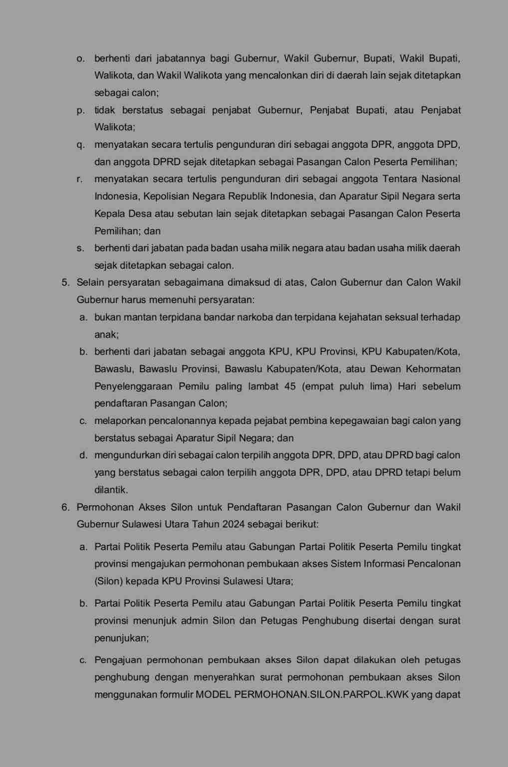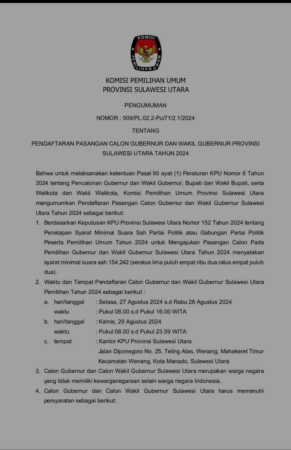 Demikianlah Pengumuman Pendaftaran Paslon Gybernur dan Wakil Gubernur tahun 2024 yang ditandatangani oleh Ketua Komisi Pemilhan Umum (KPU) Propinsi Sulawesi Utara, Kenny M Poluan tertanggal 24 Agustus 2024.(***)
