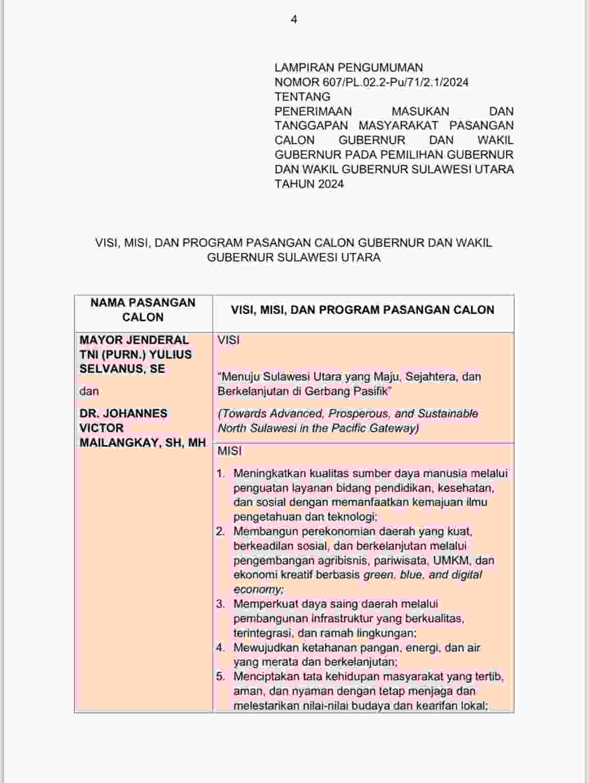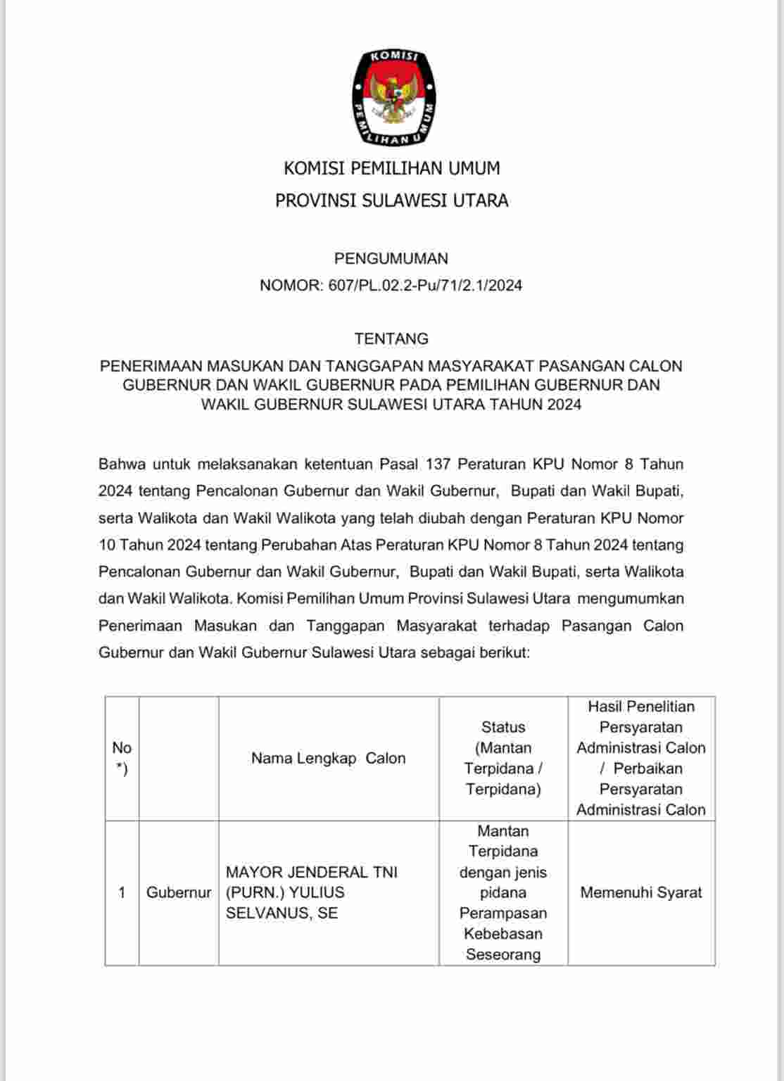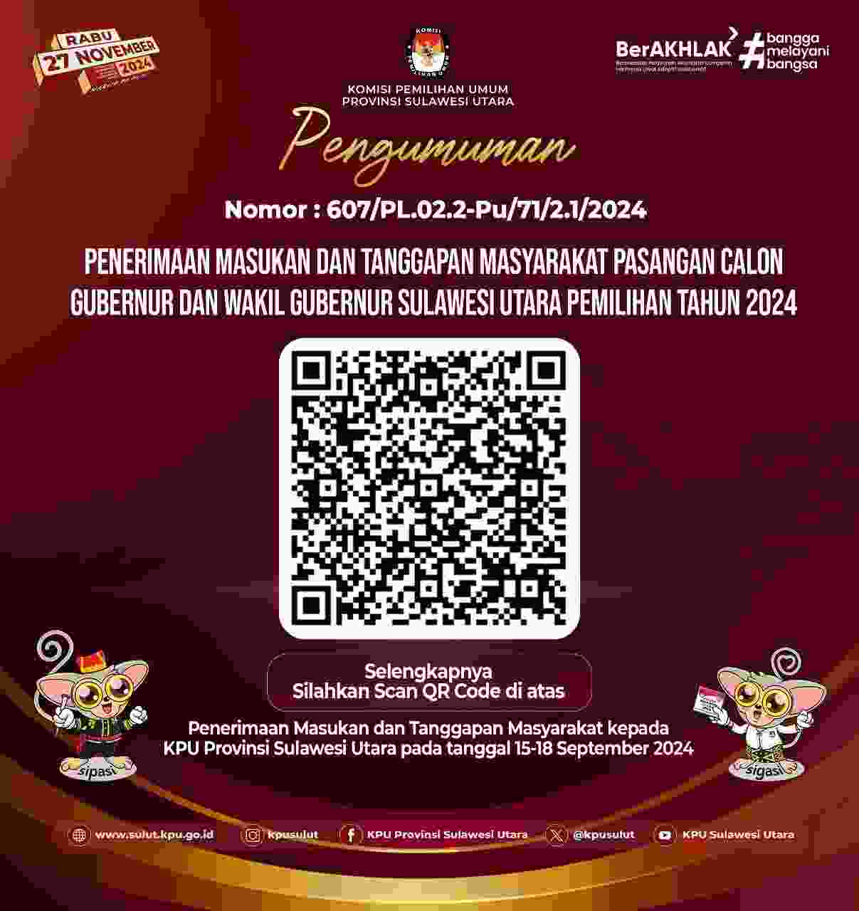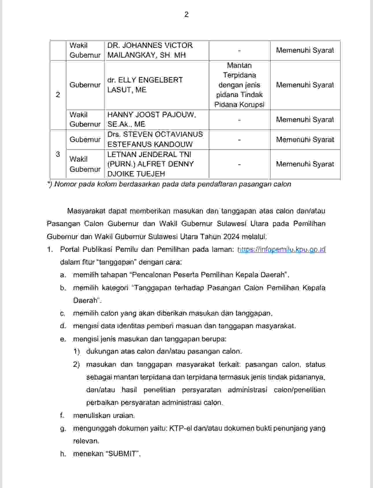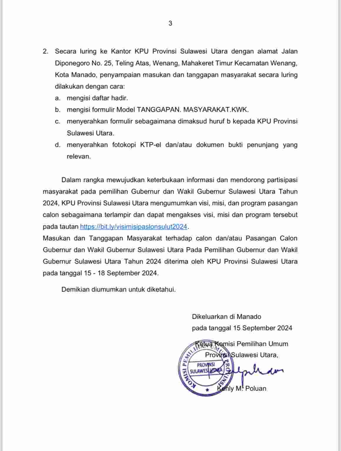 KPU Sulut Umumkan Penerimaan Masukan dan Tanggapan Masyarakat Pasangan Calon Gubernur dan Wakil Gubernur Sulawesi Utara Tahun 2024 Cipta NewsSeptember 14, 2024532 Dilihat KPU Sulut Umumkan Penerimaan Masukan dan Tanggapan Masyarakat Pasangan Calon Gubernur dan Wakil Gubernur Sulawesi Utara Tahun 2024 (kpu) Bacaan LainnyaNgabuburit Bawaslu Sulut Dihadiri Mahasiswa dan Puluhan WartawanKPU Sulut Ucapkan Terima Kasih Kepada ODSK dan YSK VictoryKPU SULUT Ucapkan Terima Kasih Kepada ODSK dan YSK Victory Lampiran Pengumuman KPU Sulut (ist) Post Views: 532 Pos terkaitINAKOR Soroti Maraknya Tambang Ilegal di Sulut, Desak Pengawasan dan Penindakan Lebih TegasPJS Sulut Tancap Gas Menuju Konstituen Dewan Pers, Desak Pengurus Lengkapi Berkas dan Perkuat Kompetensi Wartawan Lewat UKWProyek Jalan Nasional Maelang–Atinggola Disorot Inakor: Selisih Anggaran Rp152 Miliar vs Rp27 Miliar Picu Pertanyaan PublikWalikota Andrei Angouw Tinjau Lokasi di Paniki Dua, Dorong Pembangunan Rusunawa “Bhineka Tunggal Ika” di ManadoPupuk Organik “Paten” Diperkenalkan di Manado, Diklaim Tingkatkan Produktivitas Pertanian hingga 50 PersenWali Kota Andrei Angouw Hadiri Musrenbang RKPD Sulut 2027, Sinkronkan Program Prioritas Daerah