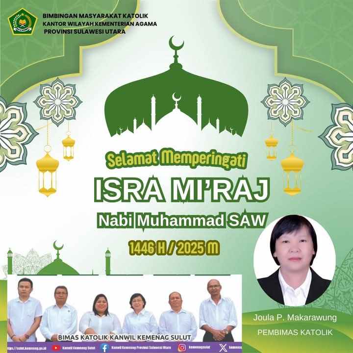 “Kami, Bimas Katolik Kanwil Kemenag Provinsi Sulawesi Utara, mengucapkan Selamat Memperingati Isra Miraj Nabi Muhammad SAW kepada saudara-saudariku umat Muslim. Semoga hari ini menjadi hari yang penuh berkah bagi kita semua,” ujar pembimas Katolik joula makaraung
