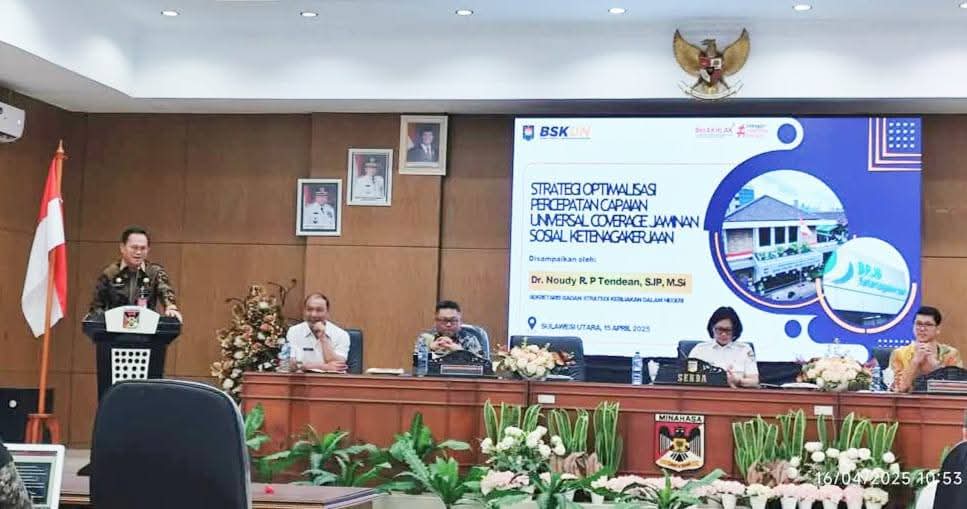 MINAHASA, ciptanews.id – Jajaran Pemerintah Kabupaten Minahasa mengikuti kegiatan Monitoring dan Evaluasi (Monev) Universal Coverage Jaminan Sosial Ketenagakerjaan yang dilaksanakan oleh Badan Strategi Kebijakan Dalam Negeri (BSKDN) Kementerian Dalam Negeri Republik Indonesia yang dilaksanakan di Ruang Sidang Kantor Bupati Minahasa, Rabu (16/04/2025).