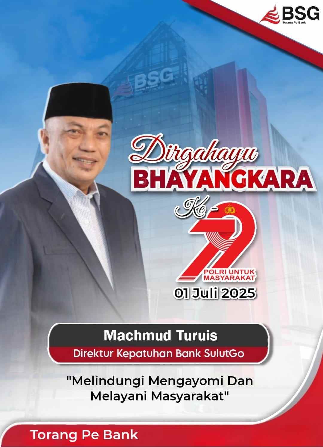 MANADO, ciptanews.id – Dalam rangka memperingati Hari Ulang Tahun (HUT) Bhayangkara ke-79 yang jatuh pada 1 Juli 2025, Direktur Kepatuhan Bank SulutGo, Machmud Turuis, menyampaikan ucapan selamat dan apresiasi setinggi-tingginya kepada seluruh jajaran Kepolisian Negara Republik Indonesia.