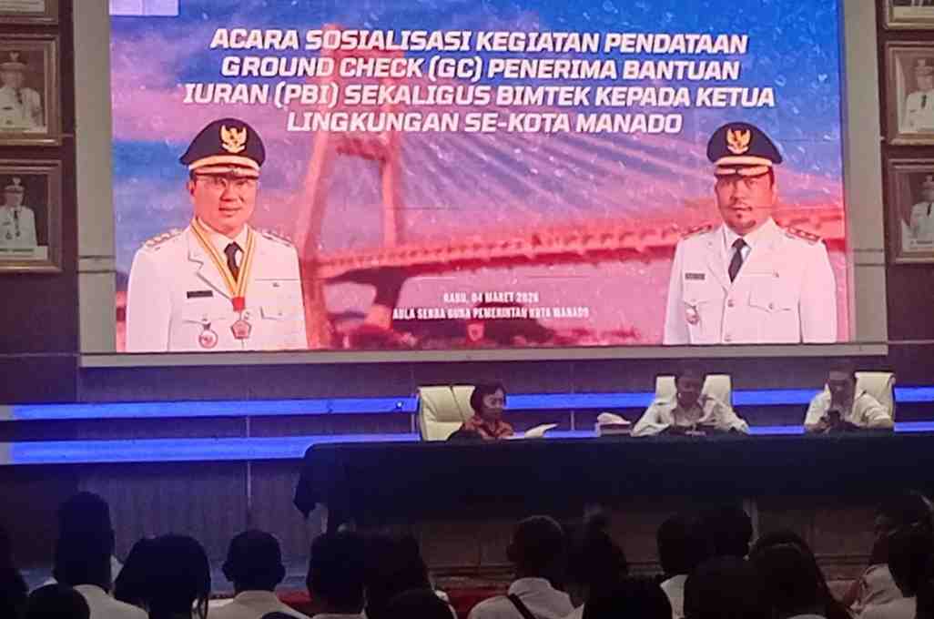 MANADO, Ciptanews – Wali Kota Manado, Andrei Angouw, menghadiri Sosialisasi Kegiatan Pendataan Ground Check (GC) Penerimaan Bantuan Iuran (PBI) sekaligus Bimbingan Teknis (Bimtek) bagi Ketua Lingkungan se-Kota Manado, Rabu (4/3/2026). Kegiatan tersebut digelar di Aula Serbaguna Kantor Wali Kota Manado.