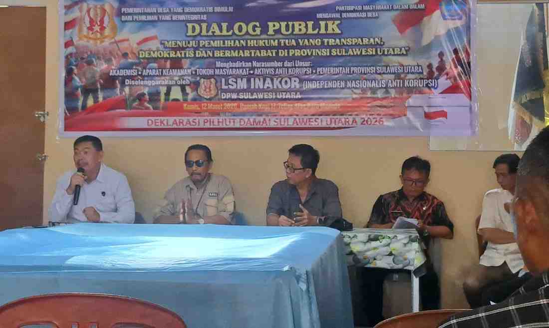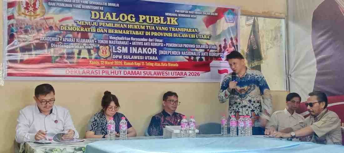 MANADO, CiptaNews.id – Lembaga Swadaya Masyarakat Independen Nasionalis Anti Korupsi (INAKOR) DPW Sulawesi Utara menggelar Dialog Publik bertema “Menuju Pemilihan Hukum Tua yang Transparan, Demokratis, dan Bermartabat di Sulawesi Utara.” Kegiatan ini merupakan bentuk kontribusi masyarakat sipil dalam mendorong pelaksanaan demokrasi desa yang jujur, transparan, dan kondusif, Kamis (12/03/2026).