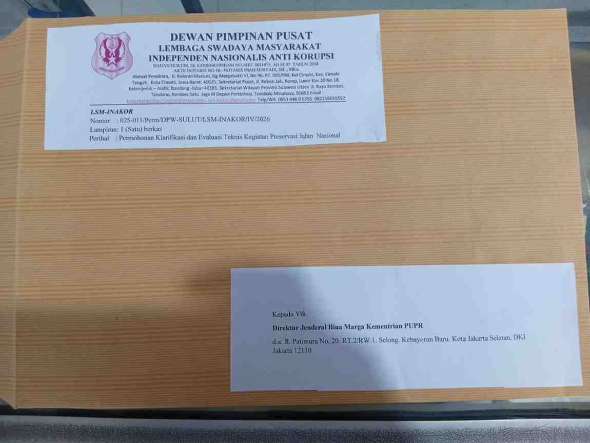 MANADO, CiptaNews.id — LSM INAKOR Sulawesi Utara resmi melayangkan surat permohonan klarifikasi kepada Direktorat Jenderal Bina Marga terkait kegiatan preservasi jalan nasional pada ruas Maelang–Batas Bolmong/Bolmut–Biontong–Atinggola (akses Terminal Boroko).